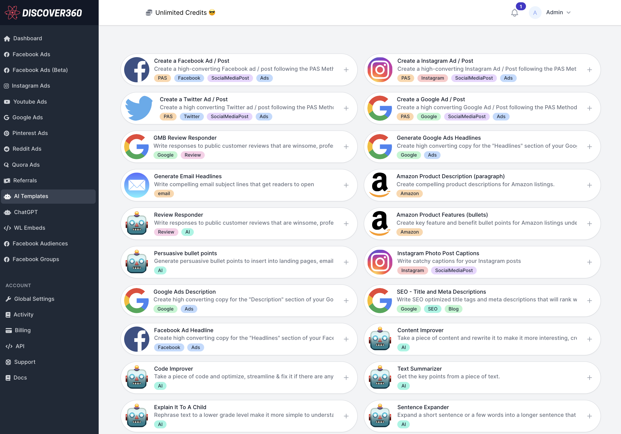 AI Templates is your all-in-one solution for generating high-converting content across various platforms. Whether you're looking to create captivating Facebook ads, Instagram posts, Google ads, or even optimize your Amazon product descriptions, AI Templates has got you covered.
