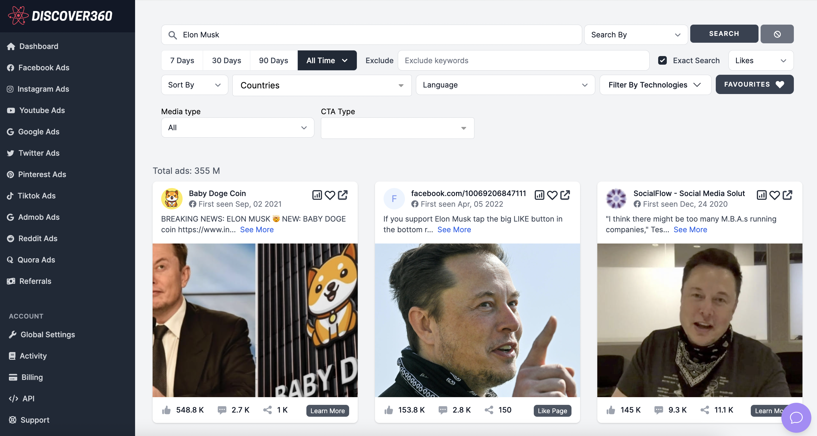 Discover360 gives you the world's largest ad library to search with over 1+ billion ads from 100+ different countries with thousands of new ads added daily.